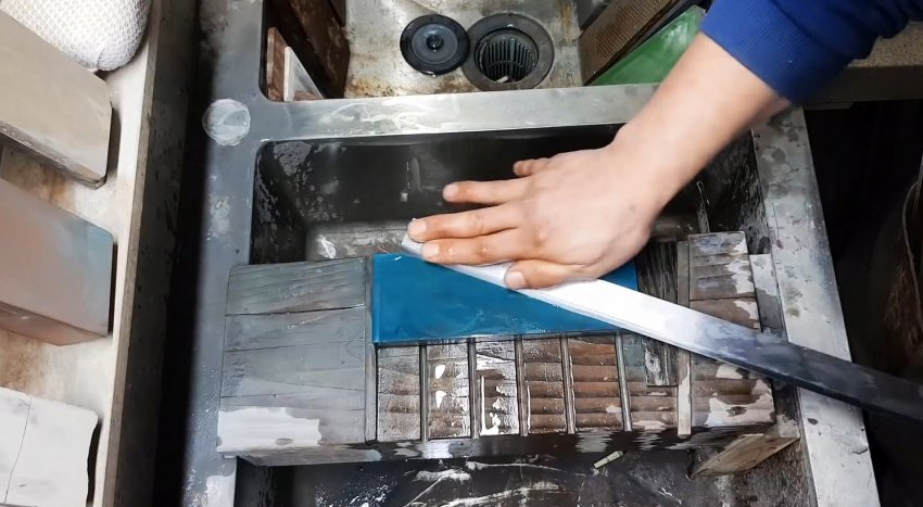 На горизонтальную ровную поверхность укладываем достаточной длины ленту наждачной бумаги и закрепляем ее. Ножи, закрепленные в приспособлении, укладываем на наждачку и совершаем возвратно-поступательные движения, прижимая их к ленте с одинаковым усилием. Время заточки зависит от степени износа и количества ножей.