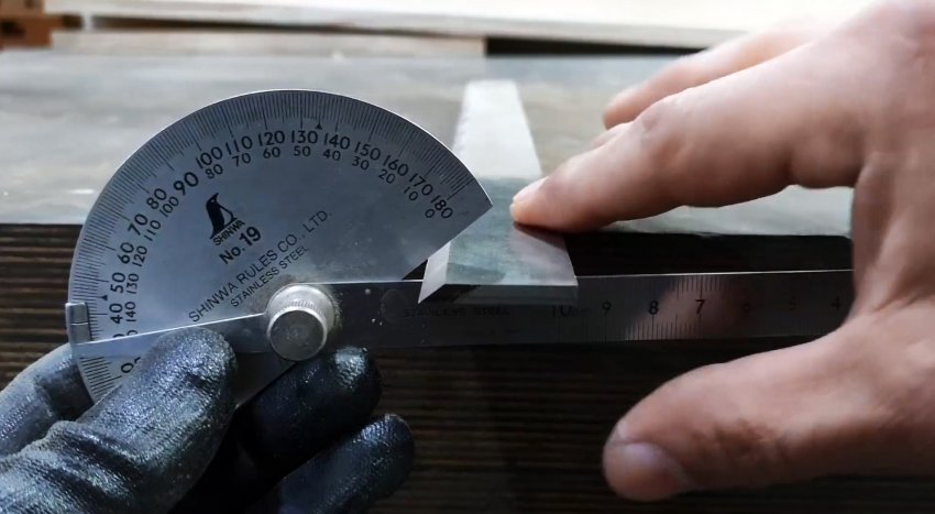 Для правильной заточки ножей фуговального станка сделаем приспособление. Начнем с измерения угла их заточки, который оказался равным 38 градусам, но может быть и другим.