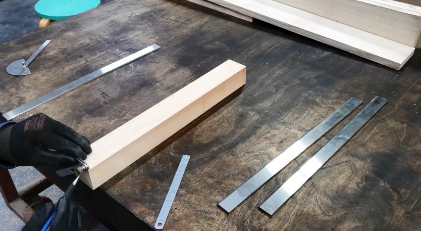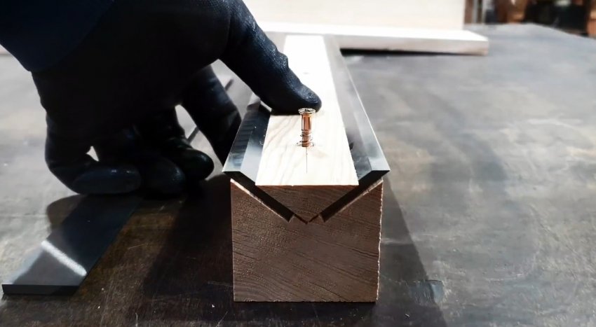 Затупившиеся ножи укладываем на наклонные плоскости проема бруса так, чтобы их тыльные стороны легли на упоры. Треугольную планку укладываем поверх ножей, заворачиваем шурупы, зажимая ножи в брусе. Металлической линейки проверяем расположение поверхностей заточки в одной плоскости.