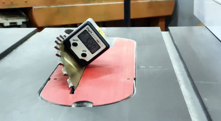 Наклоняем диск циркулярной пилы на заданный угол заточки с помощью электронного измерителя углов. У нас угол наклона диска циркулярки должен быть равен 52 градусам, т. е. дополнением до 90 градусов (38+52).