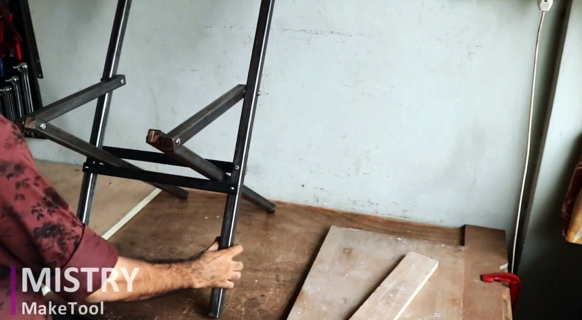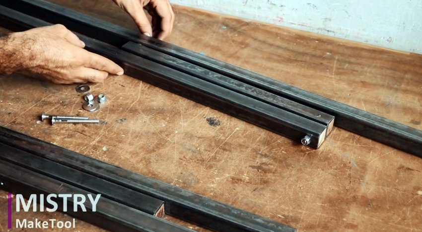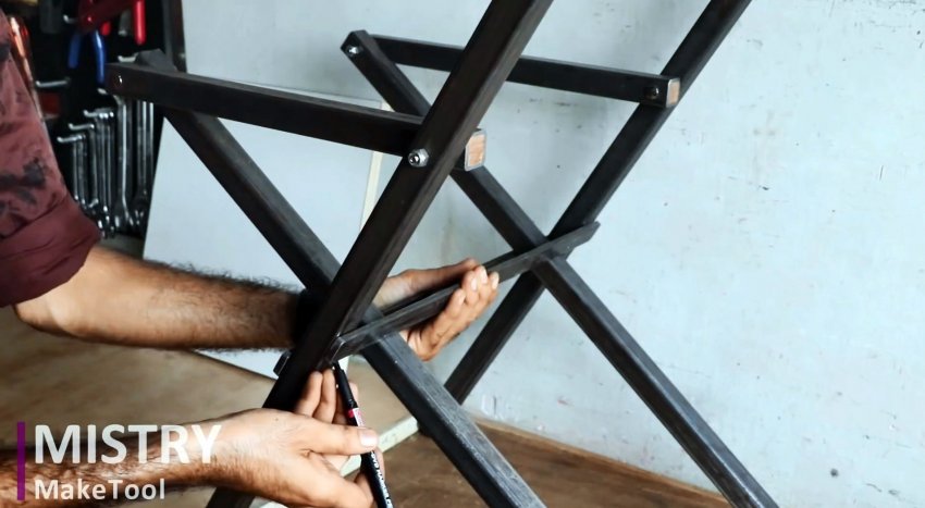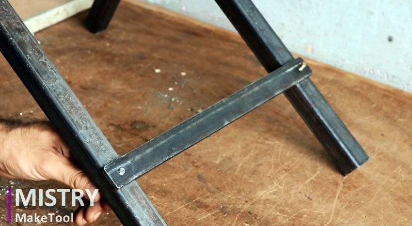 По отверстиям в полосах сверлим соответствующие отверстия в передних ножках с двух сторон и стягиваем их поперечными полосами с помощью болтов. Эти полосы не позволят передним ножкам расходиться в стороны под нагрузкой и служат направляющими для задних ножек.