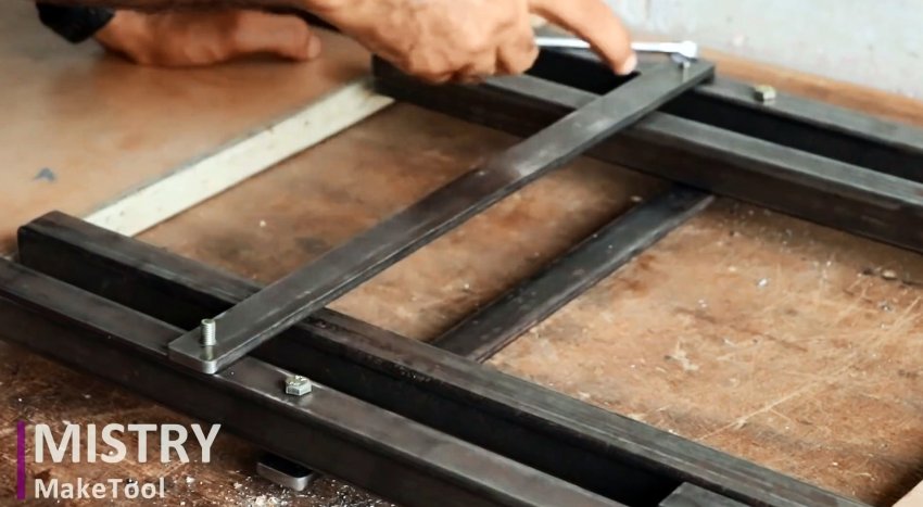 Скрепляем заготовки из квадратных труб болтами со скругленными головками, шайбами и гайками. К длинным заготовкам по центру прикручиваем короткие, а к ним – средние по длине.