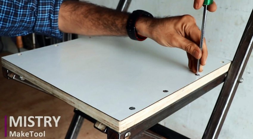Уложив сидение на место, сверлим отверстия в нем и силовых элементах. Скрепляем эти детали винтами с плоскими потайными головками.