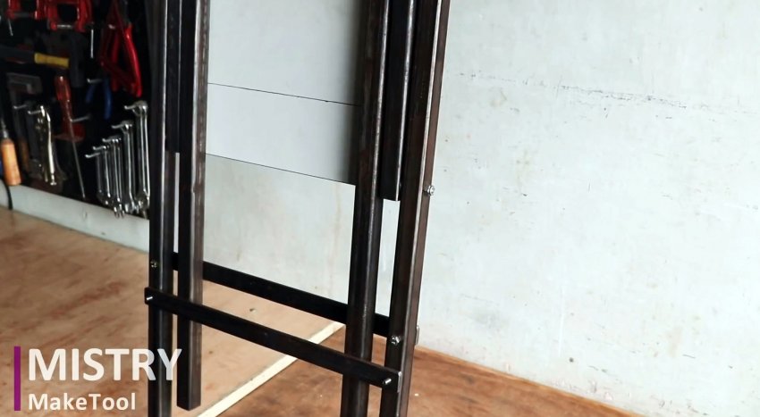 Придаем жесткость задним ножкам, скрепляя их между собой стальной пластиной ближе к нижним концам по сквозным отверстиям в ножках и отверстиям в полосе с резьбой болтами.