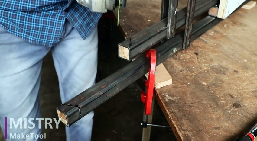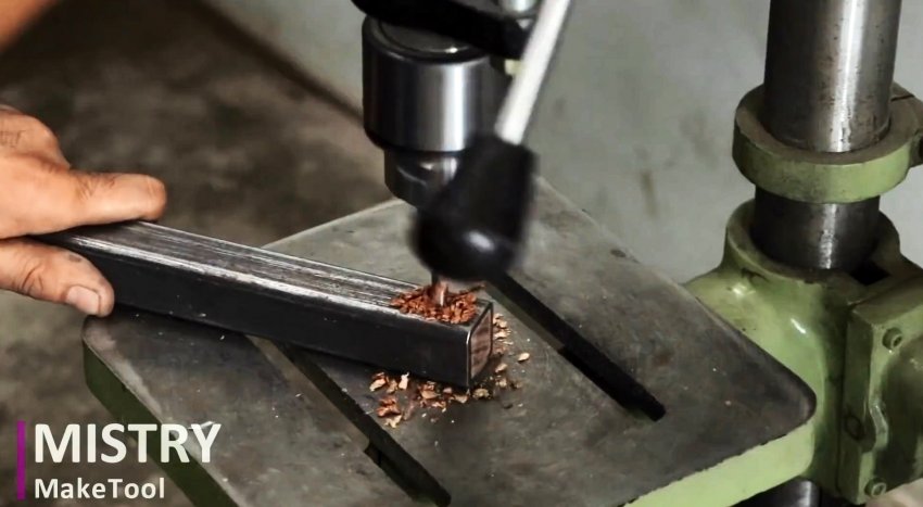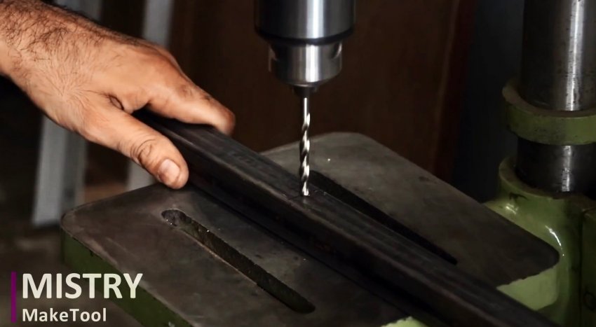 Прикладываем поперечно две стальные одинаковые полосы к передним ножкам с лицевой и тыльной стороны в обхват задних ножек. Делаем разметку, сверлим отверстия и выполняем резьбу в отверстиях полос.