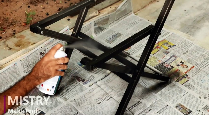 Сняв спинку и сидение, окрашиваем металлические элементы раскладного стула аэрозольной краской и после ее высыхания возвращаем на место спинку и сидение.