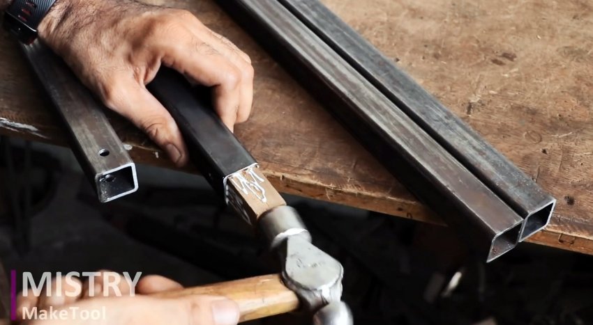 Нарезаем из деревянного бруса-квадрата внутренние заглушки, наносим на них клей и вбиваем молотком в торцы заготовок из профильной трубы.