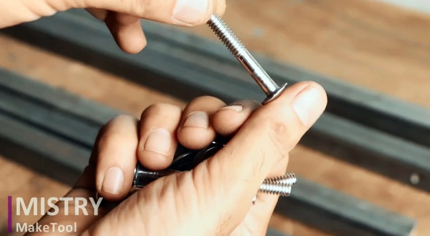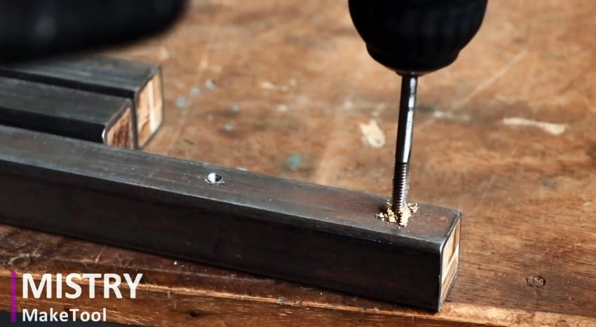По отверстиям в спинке намечаем и сверлим отверстия в квадратных заготовках и нарезаем метчиком резьбу. Закрепляем спинку к заготовкам винтами с потайной головкой.