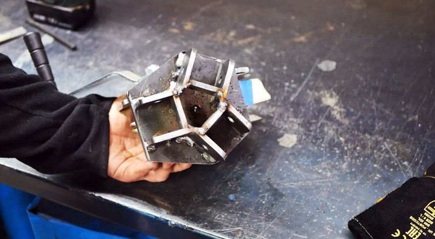 От стальной полосы отрезаем две равные заготовки, свариваем их между собой и по центру сверлим отверстие, а рядом на оси заготовки другое поменьше.