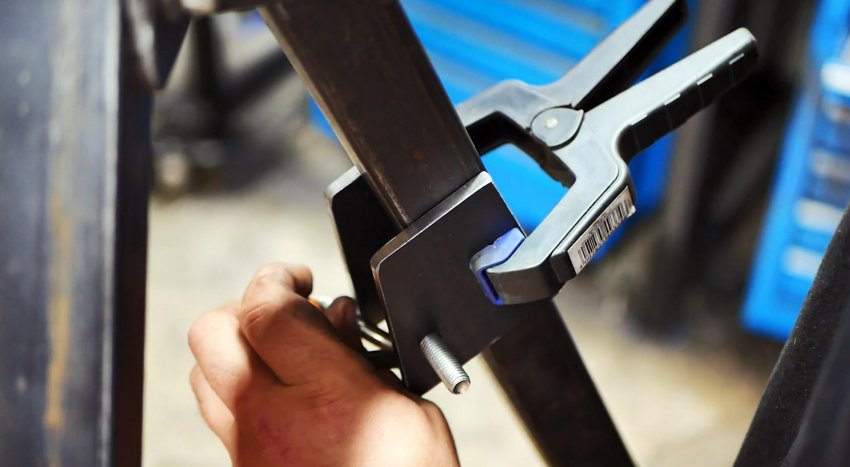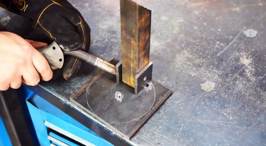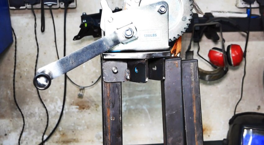 Размещаем их по бокам одной из ножек ближе к основанию лебедки, фиксируем струбциной и привариваем.