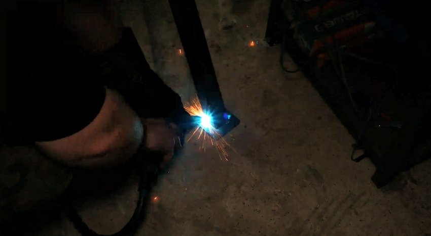 Разводим ножки, выполняем на нижних концах скосы и привариваем опорные пятки.