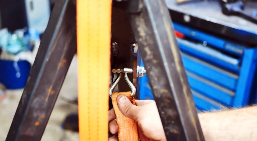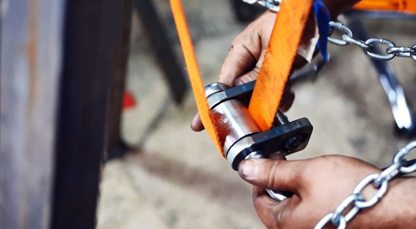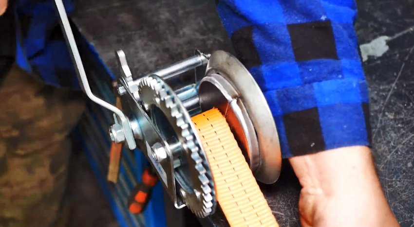 Заменяем стальной трос на типовой лебедке транспортным ремнем, более прочным, удобным и безопасным. Проверяем работу лебедки и храпового механизма.
