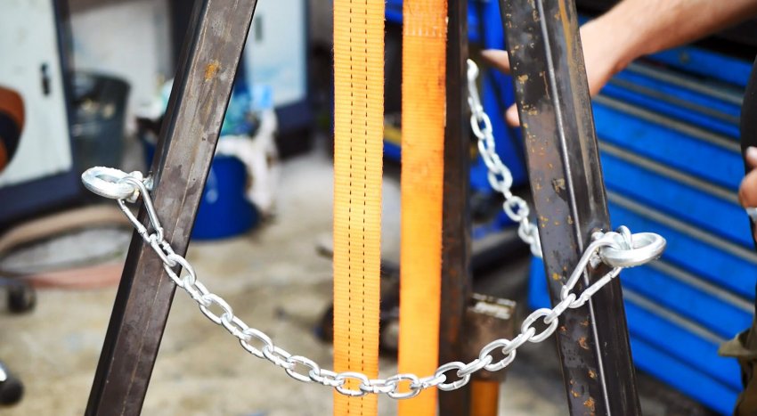 Примерно посередине трех ножек сверлим отверстия, нарезаем резьбу и вкручиваем рым-болты, которые надежно затягиваем и прихватываем сваркой.