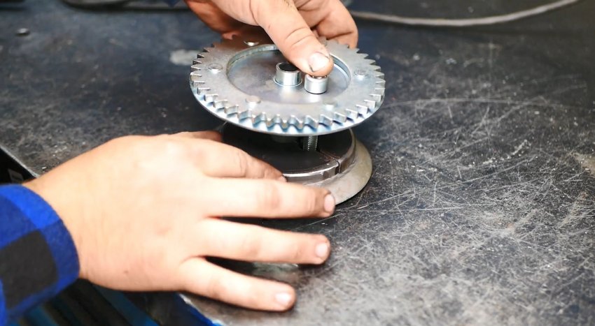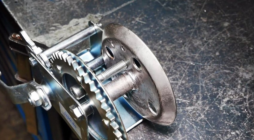 Откручиваем центральный болт с гайкой. Отступив некоторое расстояние от центрального отверстия, выполняем отверстия в дисках лебедки.