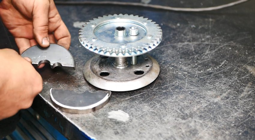 Половинки укладываем на ограничительный диск лебедки изнутри так, чтобы они полу-отверстиями обхватили центральную трубчатую ось и болт, установленный с эксцентриситетом, и привариваем их к диску.