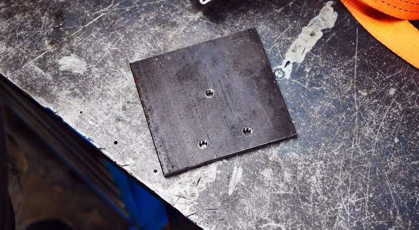 По разметке на квадратном по форме фрагменте из стального листа выполняем три отверстия и нарезаем в них резьбу. Устанавливаем на него основанием лебедку и прикручиваем тремя болтами.