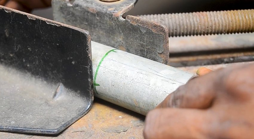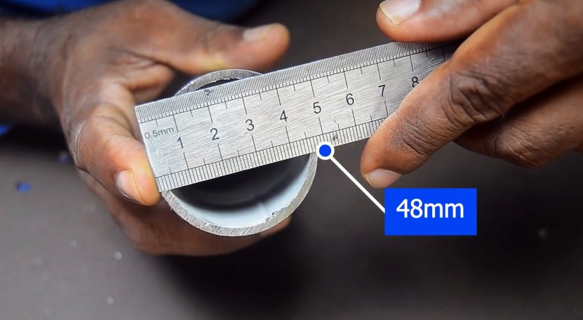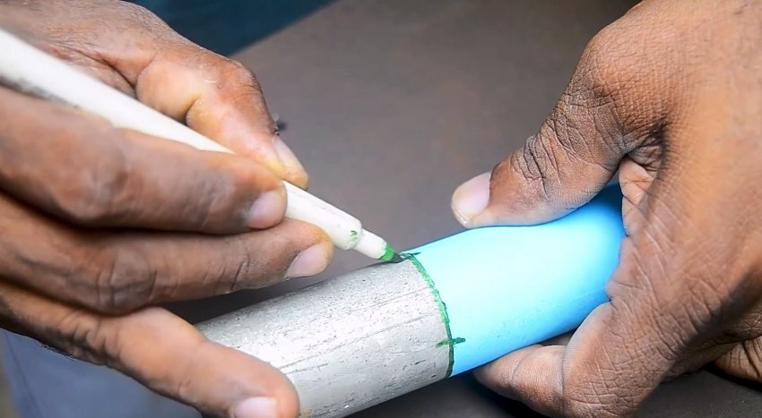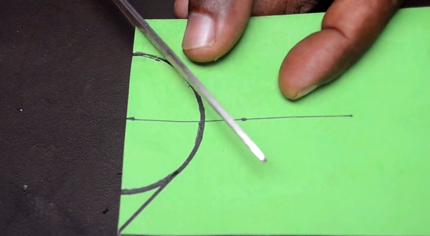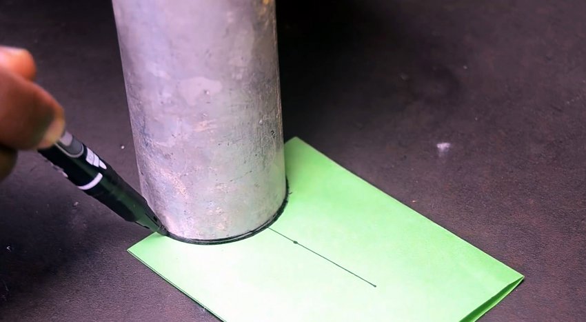 По обе стороны от линии на расстоянии радиуса трубы ставятся две отметки. На центральной линии также откладывается радиус трубы. Она (или обрезок) устанавливается между трёх отметок и обводится.