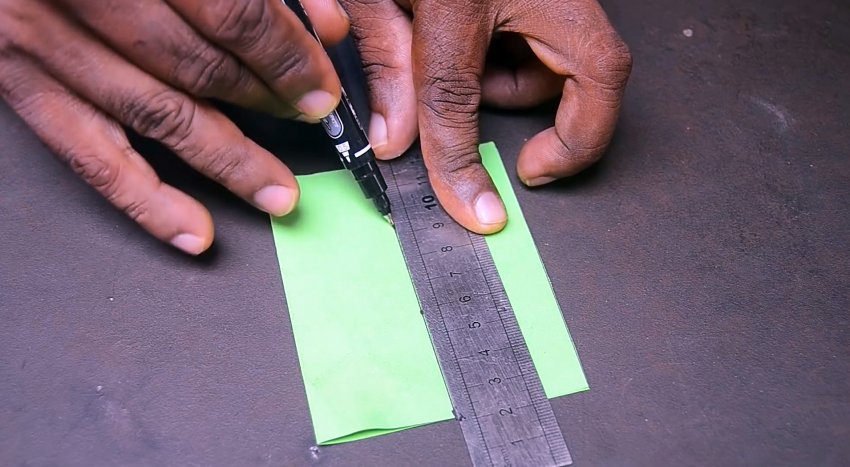 Лишняя часть бумажки отрезается. Далее – сворачивается вдвое по длине. Посредине в направлении ширины проводится разметочная линия.
