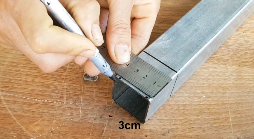 Затем на краю трубы с каждой стороны нужно нанести метки, расстояние между которыми равно ширине меньшей трубы, то есть составляет 30 мм. При этом они должны быть отдалены от углов на одинаковом расстоянии. Соответственно, метки ставятся с отступом по 5 мм от углов.