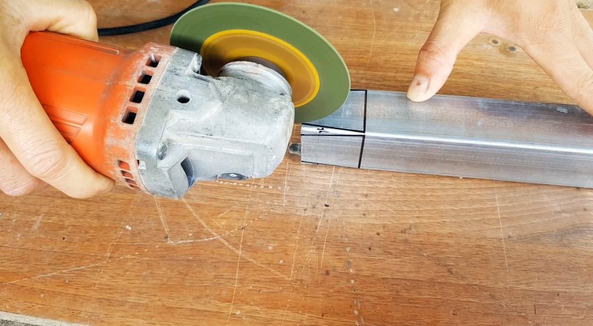 Далее на каждой стороне трубы чертим линию от меток до краев поперечных линий. Затем режем болгаркой по укосинам, тем самым удаляем клинышки.