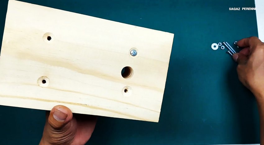 Используя отверстия в рабочем столе в качестве шаблонов, сверлим отверстия в сдвоенной заготовке из доски и вставляем в них винты нужной длины.