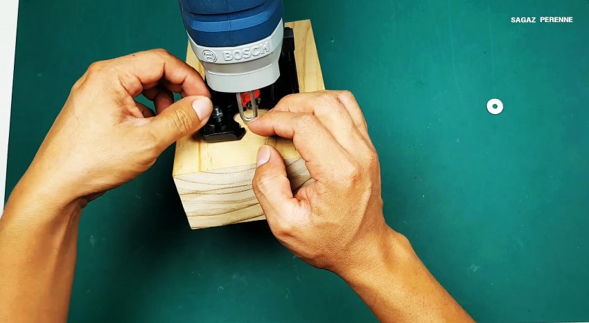 С помощью винтов, шайб и гаек крепим к сдвоенной деревянной детали соответствующим образом ориентированный электролобзик.