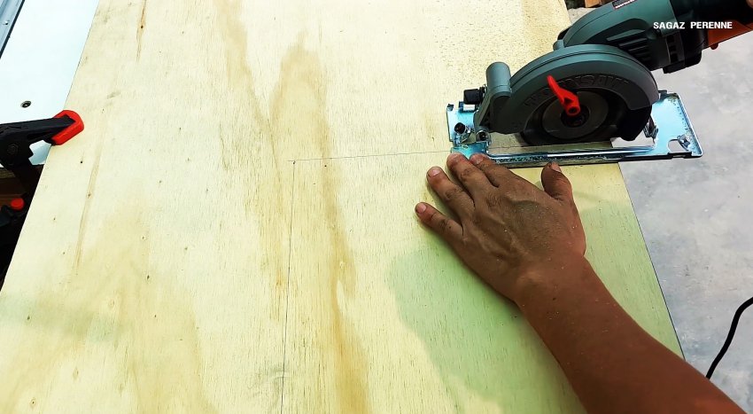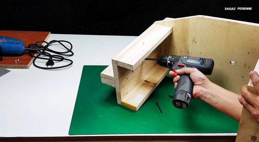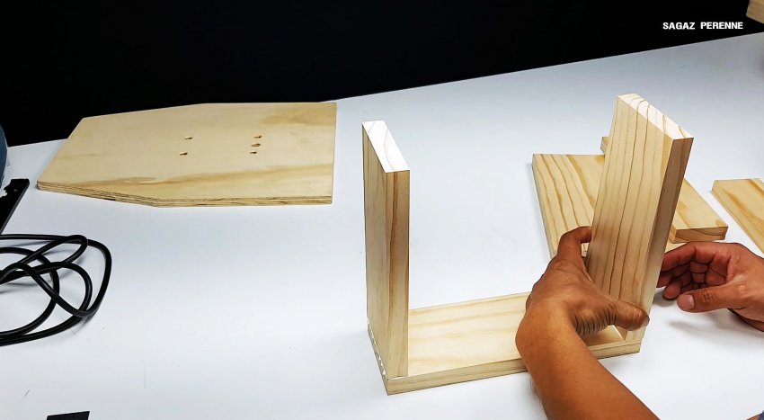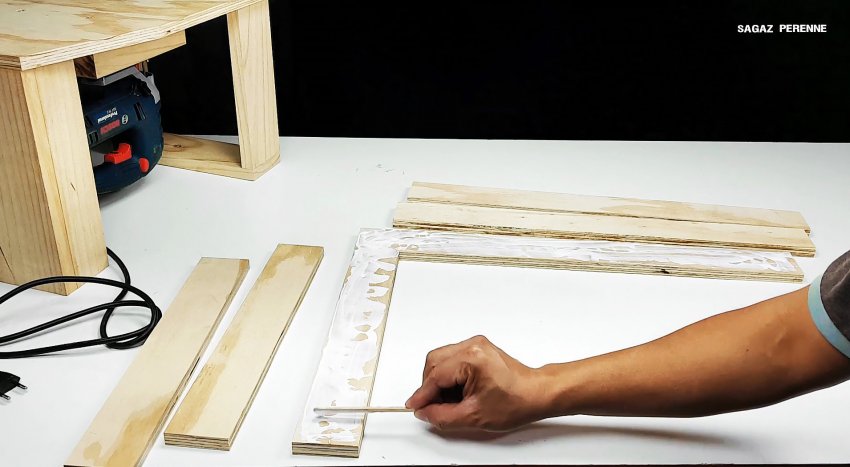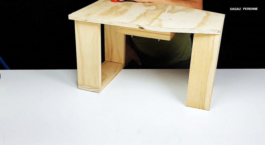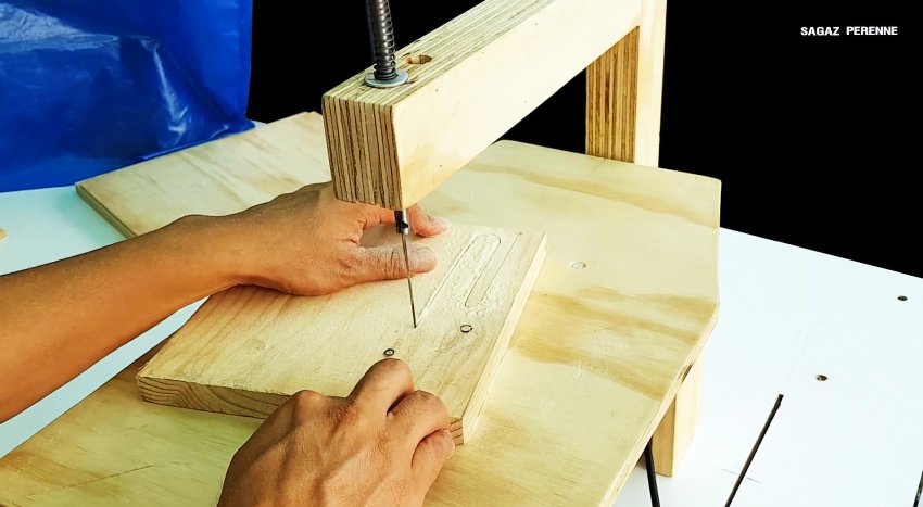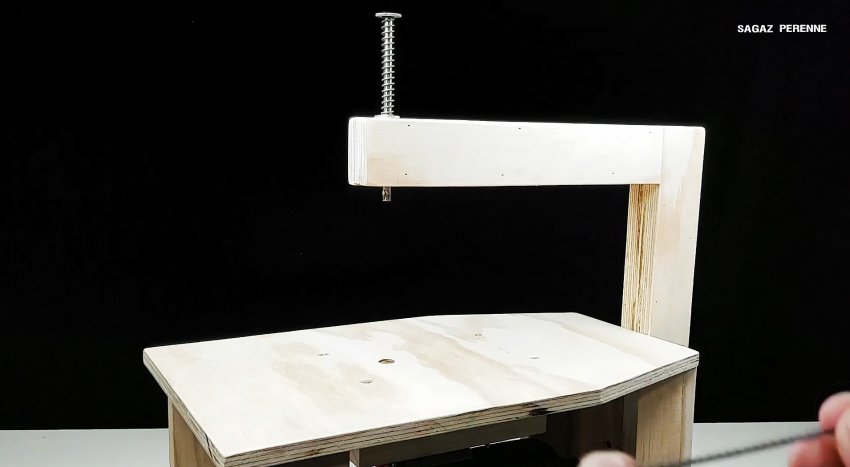 Сдвоенную заготовку шляпками винтов укладываем на рабочий стол и снизу закрепляем шурупами. Рабочий стол сдвоенной деталью вниз укладываем на ножки и закрепляем клеем и гвоздями. Переворачиваем конструкцию и к стержням болтов, выступающих из сдвоенной заготовки, крепим опорную подошву электролобзика. Из фанеры вырезаем полосы одинаковой ширины, но разной длины. Склеиваем их между собой так, чтобы получилась Г-образная стойка. На конце меньшего элемента сверлим отверстие сверлом Форстнера.