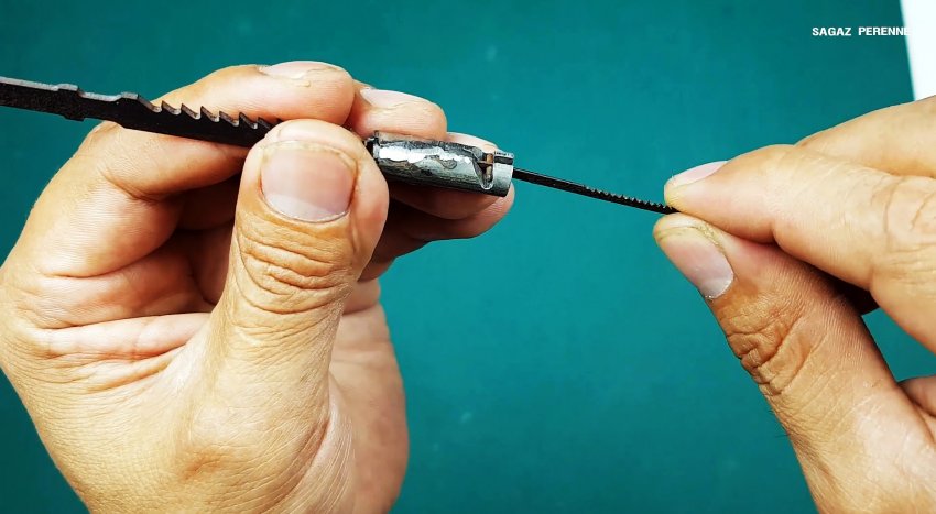 Снимаем пилку ручного лобзика. Также освобождаем пилку электролобзика и при ее максимальном вылете делаем метку на уровне подошвы и по ней укорачиваем. Из болта вырезаем переходник с одной пилки на другую.