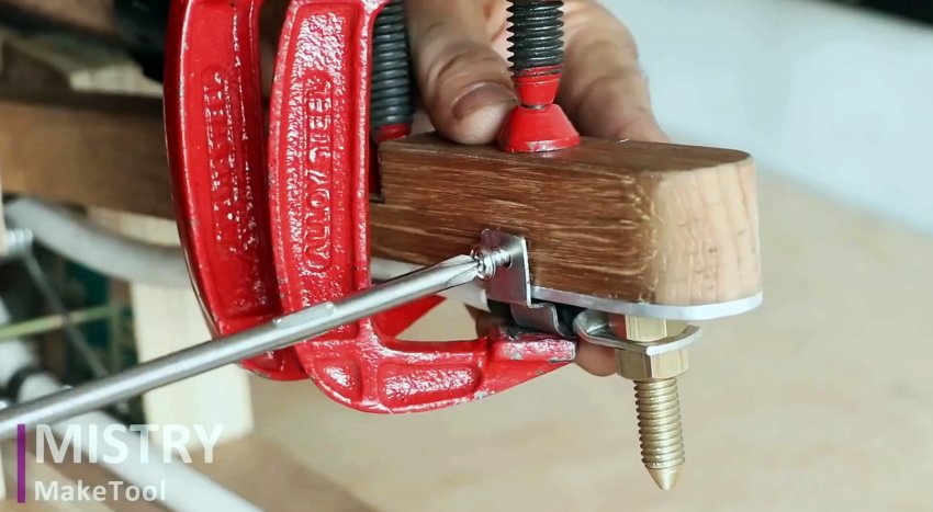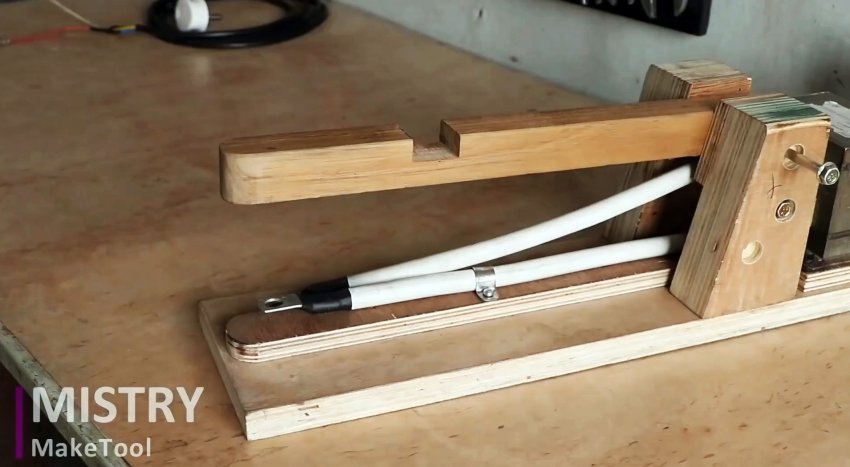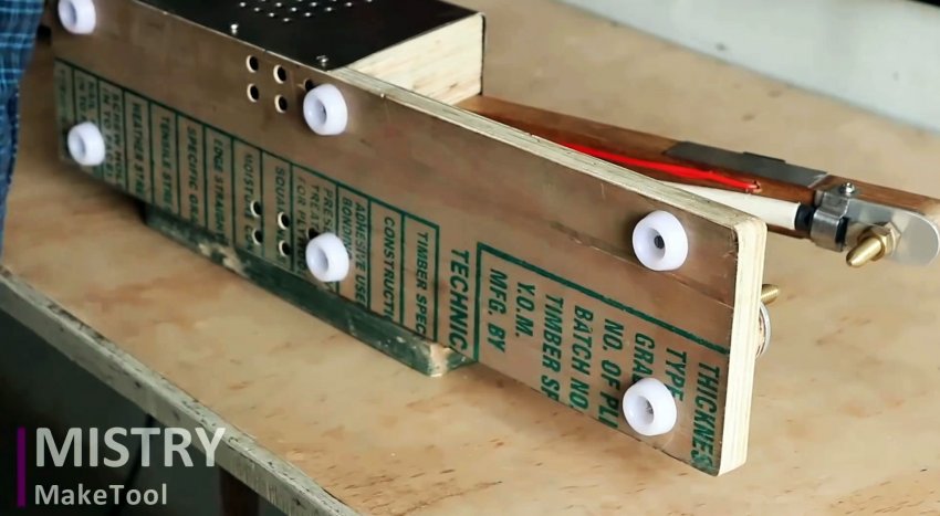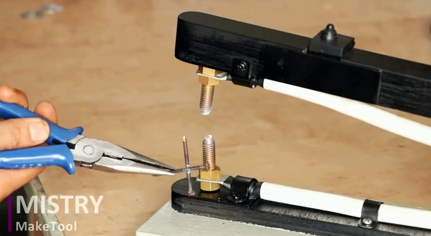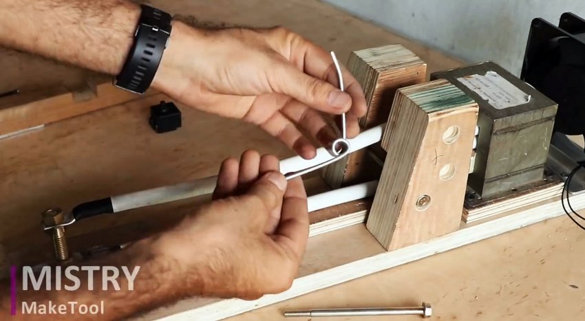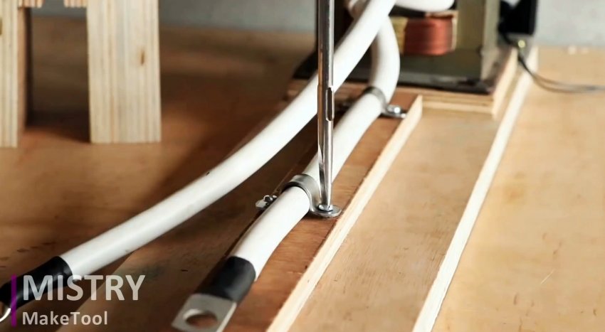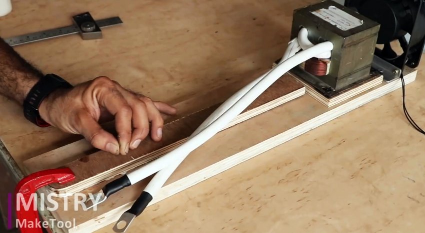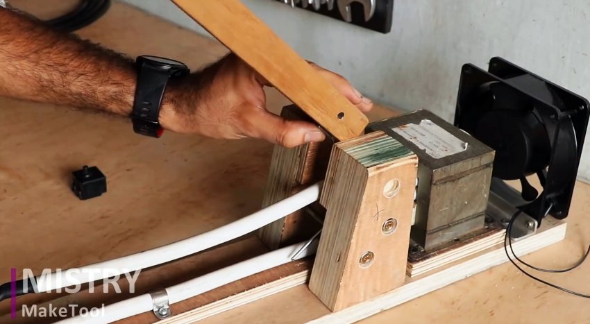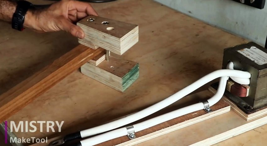Части с косиной и накладками ставим на основание и прижимаем к трансформатору вертикальной стороной так, чтобы между ними сверху свободно качался брус из дерева.