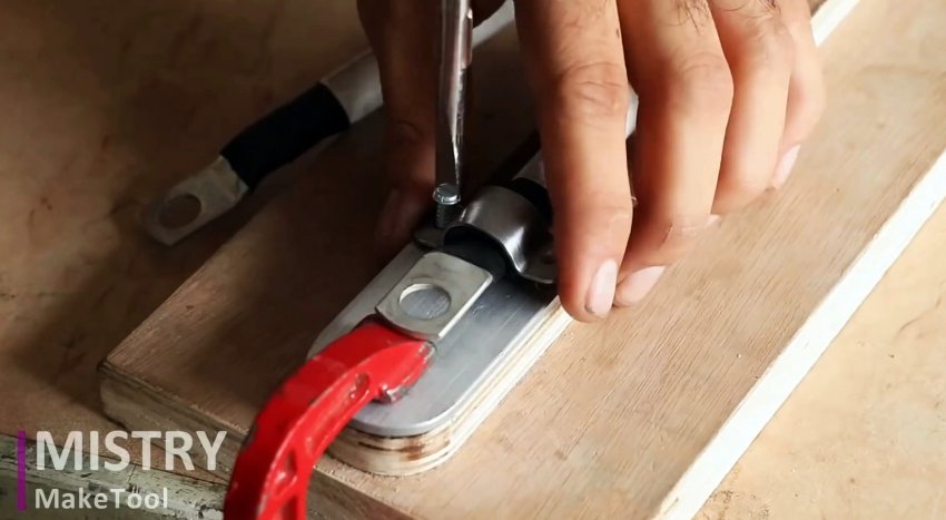 Провод с тремя жилами пропускаем через отверстие в кожухе и закрепляем его хомутом к алюминиевой пластине. Одну жилу крепим к массе.