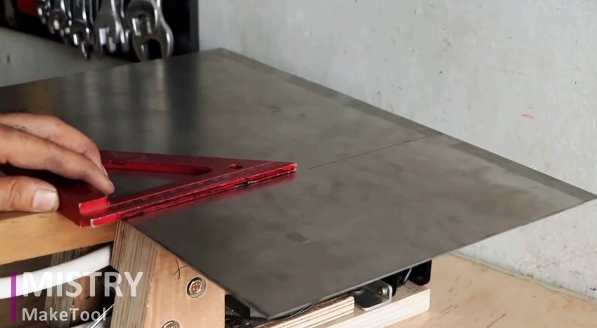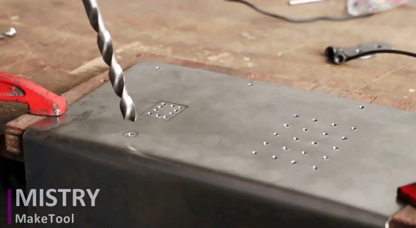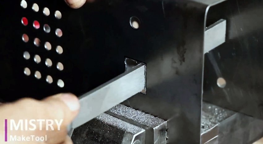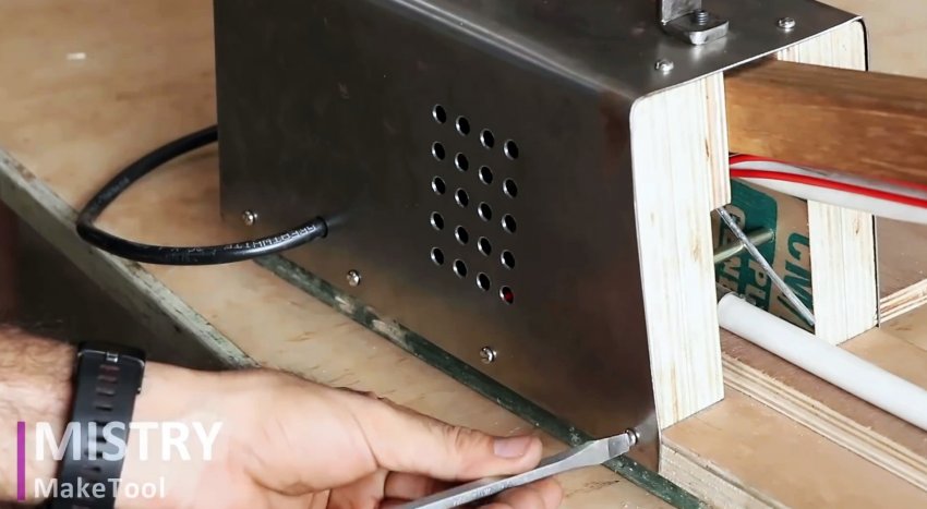 Из металлического листа сгибаем кожух на ручном гибочном станке для трансформатора и вентилятора. В его стенках выполняем гнезда и отверстия.