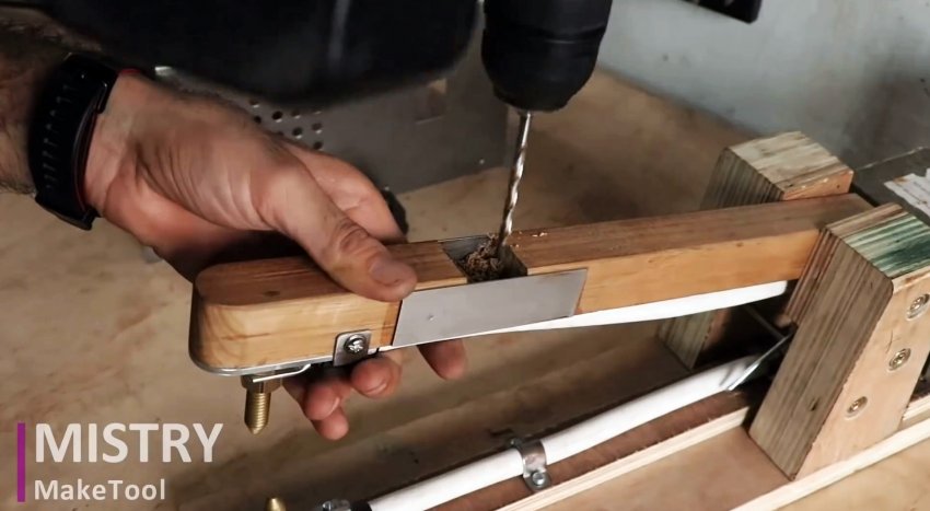 В верхнее отверстие вставляем болт, вокруг которого будет качаться деревянный брус между двумя стойками.