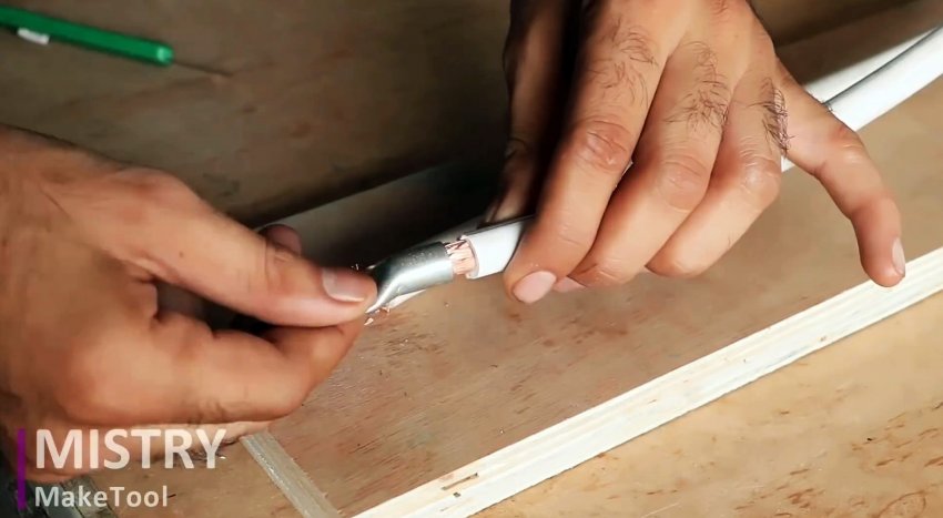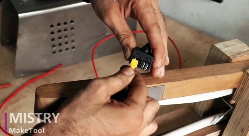 В дне прорези под переключатель сверлим два отверстия под провода и подсоединяем их к переключателю.
