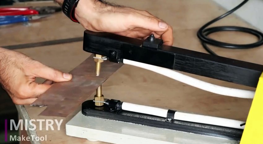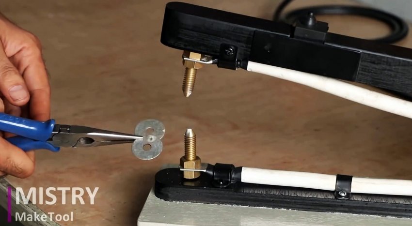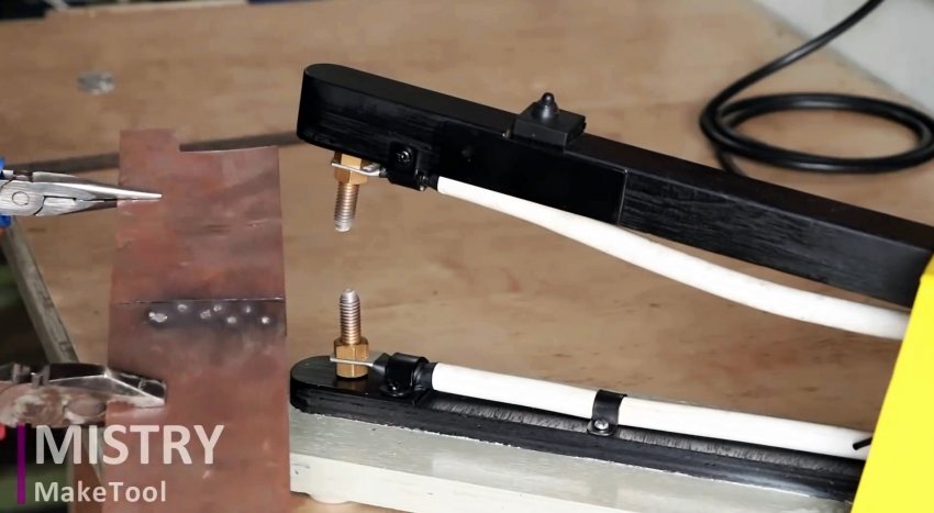 Включаем вилку питающего кабеля в розетку, выключатель переводим в положение «Включено», и при светящемся индикаторе, приступаем к сварке деталей, прижимая верхний электрод к свариваемым деталям, лежащими на нижнем электроде.