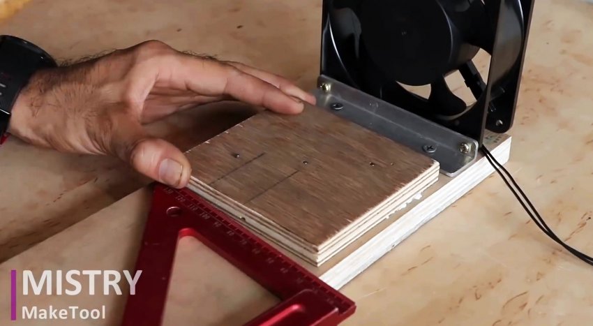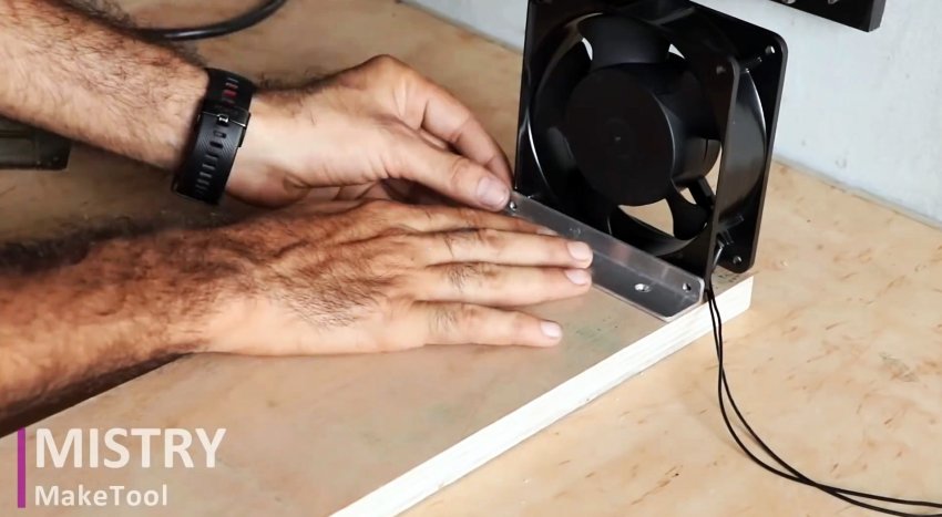 К полосе многослойной фанеры поперечно по торцу с помощью уголка из алюминия крепим вентилятор.