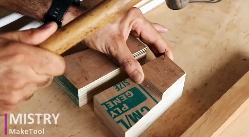Квадрат многослойной фанеры приклеиваем и прибиваем гвоздями к полосе перед вентилятором.