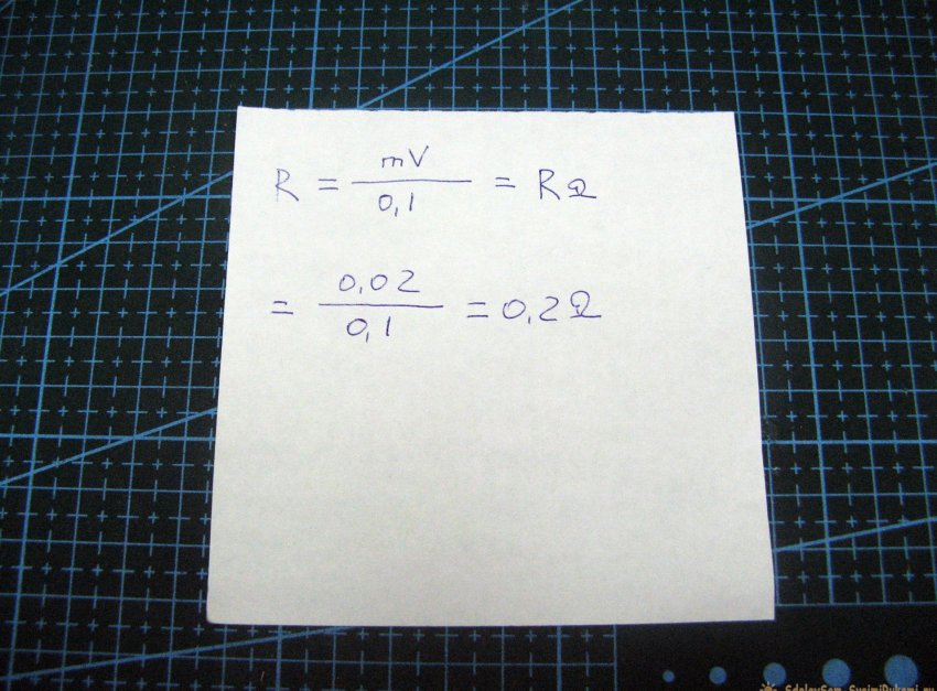 По закону Ома выводим результат. Верхняя строка, падение напряжения на измеряемом резисторе. Нижняя строка, выставленный ток цепи.
