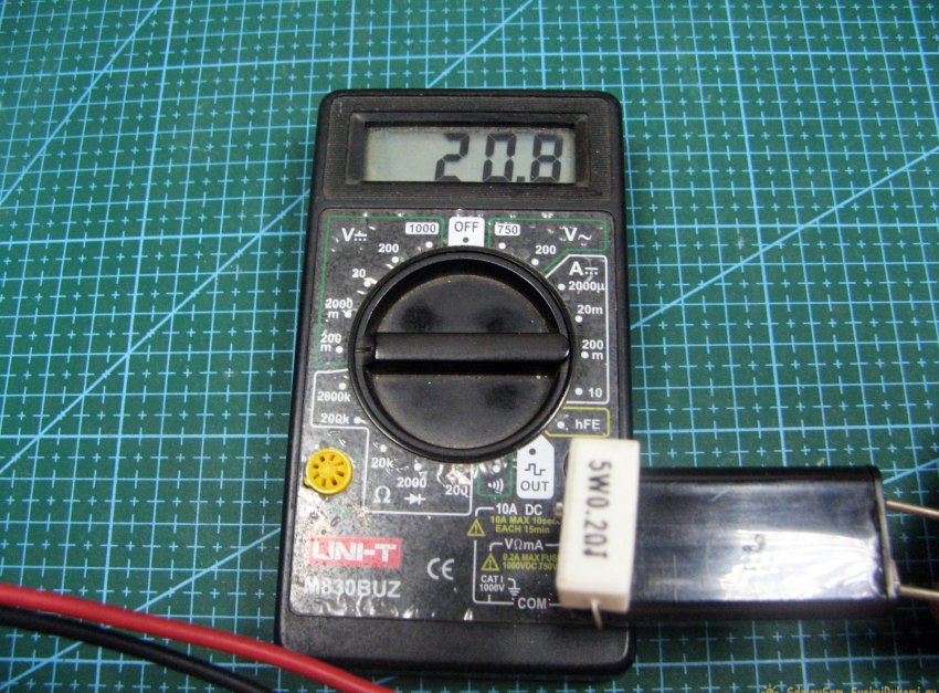 Прикручиваем измеряемый резистор. Подаем питание на приставку. Можно от кроны, но свежей. Я подам напряжение от БП. Милливольтметр показывает падение 20,8 мВ.