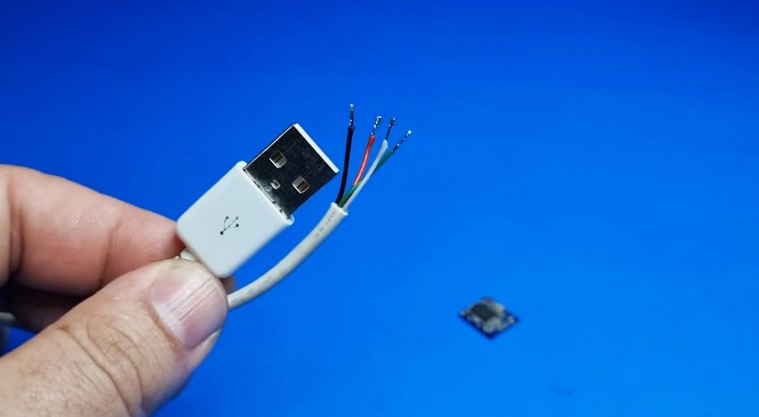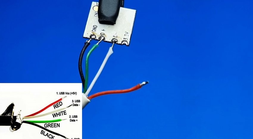 Берем USB провод, зачищаем контакты и лудим их. Распиновка цветов всегда стандартная: черный - это минус питания, красный - плюс, белый и зеленый - прямые и обратные данные.