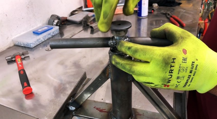 Вставляем во внутреннее отверстие подшипника так, чтобы прут уперся в нижнюю металлическую пластину. Докручиваем гайку вплотную до подшипника и свариваем.