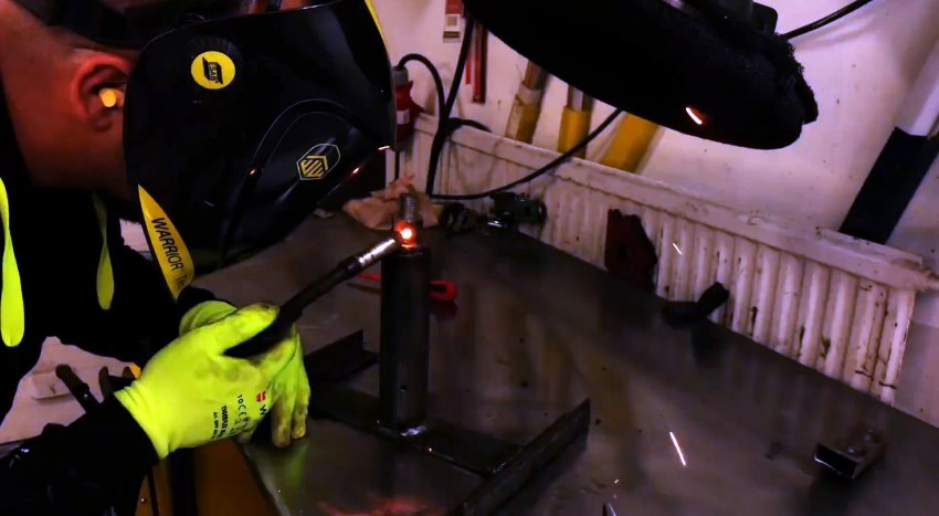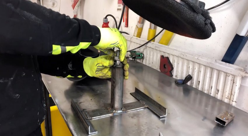 Прежде всего свариваем корпус будущего домкрата. Трубу, пластину и уголки ровно выставляем в конструкцию, где к обеим сторонам пластины присоединяются уголки, а по центру – труба.