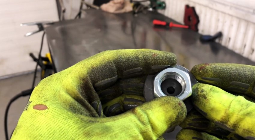 Вторую гайку привариваем к толстостенному куску металла круглой формы (это может быть большая шайба с маленьким отверстием).