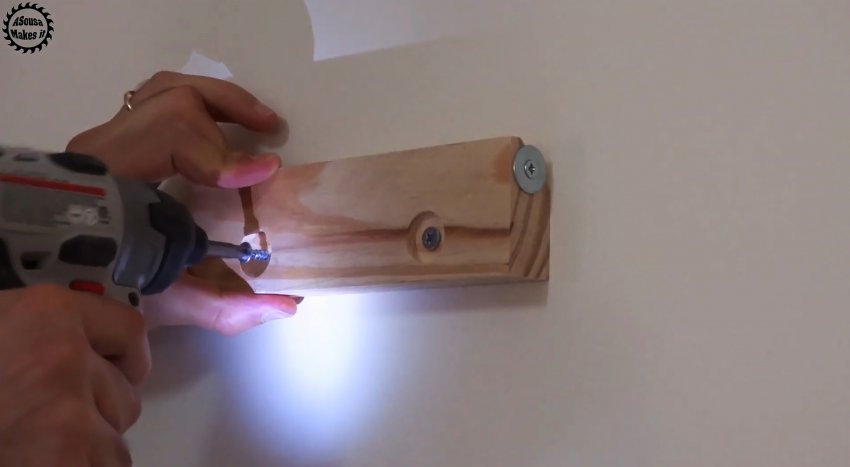 Крепим винтами в горизонтальном положении брусок с ограничительными шайбами так, чтобы кромка под 45 градусов была также направлена внутрь (к стене).