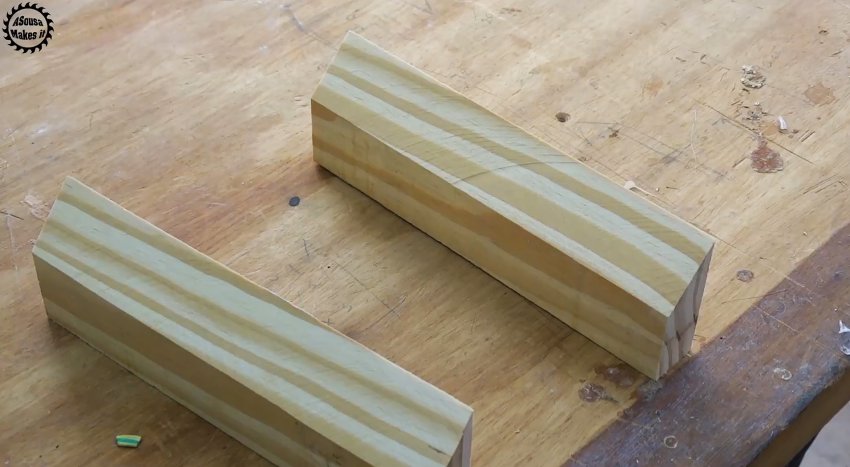 Наклоняем диск циркулярки под 45 градусов и выполняем под этим углом по одной кромке на длинных сторонах двух брусков. Для придания прочности острые края полученных кромок притупляем рубанком.