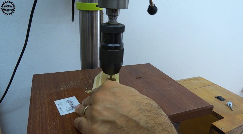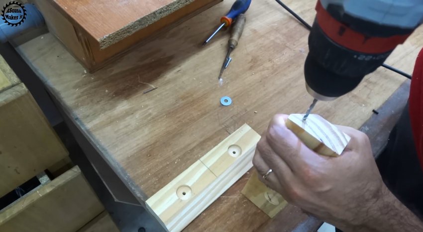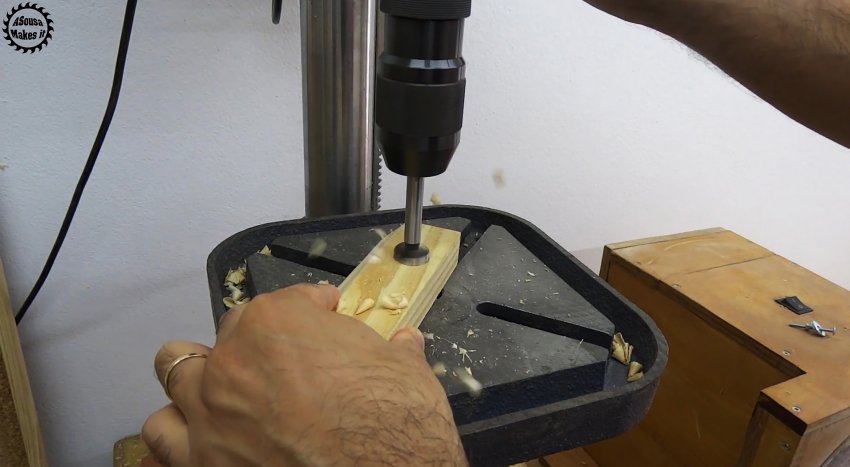 С помощью рейсшины проводим продольную осевую линию по одной из сторон брусков, отмечаем середину и от нее откладываем по 50 мм в каждую сторону. Выполняем сверлом Форстнера по два глухих отверстия в каждом бруске и по их центру сверлим сквозные отверстия меньшего диаметра.