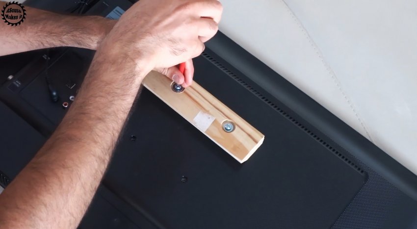 Один из брусков с помощью винтов и шайб прикручиваем к крепежным резьбовым отверстиям в задней стенке телевизора так, чтобы кромка под 45 градусов была направлена внутрь (к телевизору).