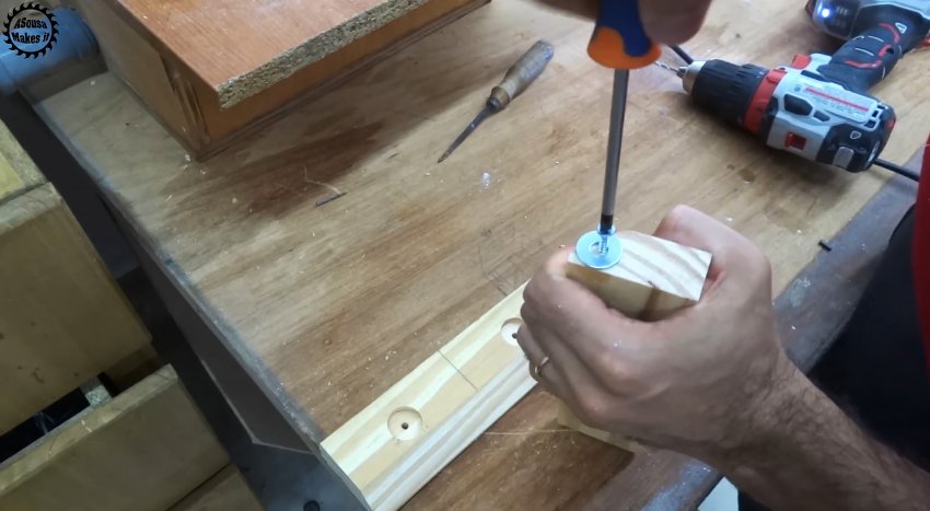 К торцам второго бруска прикручиваем винтами по шайбе, которые, возвышаясь над кромками под 45 градусов, будут служить ограничителями продольного перемещения бруска, закрепленного на телевизоре.