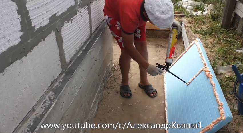 Баллончик с клеем взбалтываем, наносим на поверхность листа, выдерживаем 5 минут, прижимаем к поверхности фундамента, смоченной водой, и удерживаем несколько секунд.