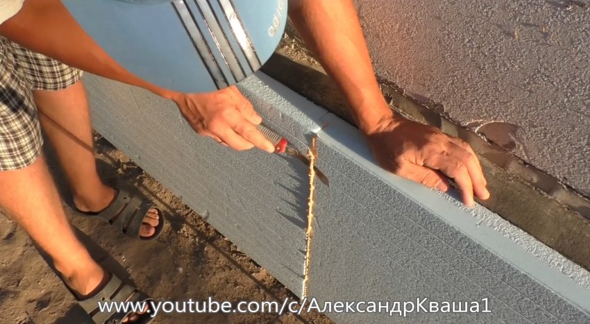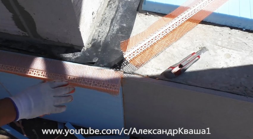 Сеточным ПВХ-уголком укрепляем верхнюю часть листов утеплителя, все углы и переходы с помощью клеящих смесей. Для этого готовим клеевую массу по инструкции на упаковке, наносим на укрепляемое место, укладываем сетку и сверху покрываем тем же составом. Режем уголок с помощью ножа.