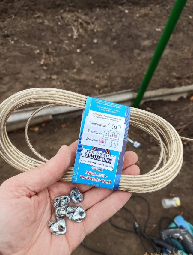 В зависимости от высоты сетки нужно два или три троса по высоте. С помощью специального хомута трос фиксируется на крайнем столбике.